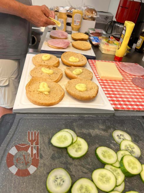 Für heute haben wir leckere Burger-Sandwiches gebastelt und mit weiteren tollen Zugaben wie Obst, Müsliriegel, Eiern und Getränken in Food-Bags verwandelt, die Rüdiger von Hand in Hand e.V. wieder mit seinem Team an Bedürftige verteilen wird.